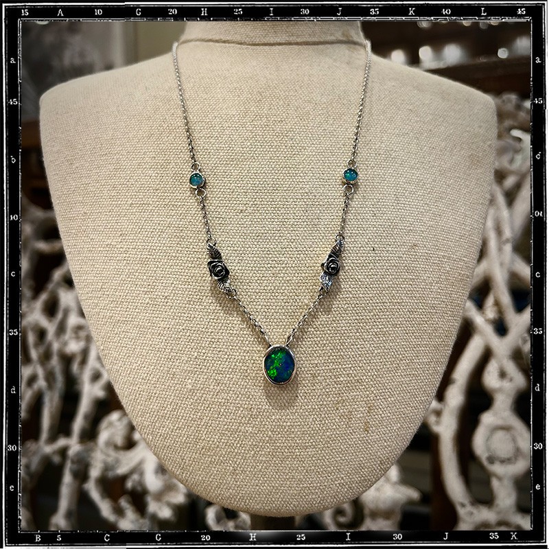 This custom one‑off necklace features two sculpted roses, two 5 mm round opal triplets, and a striking 10 × 12 mm opal triplet at its centre. Lightweight and dainty with a pop of colour, this necklace is perfect for both everyday wear and for special occasions.